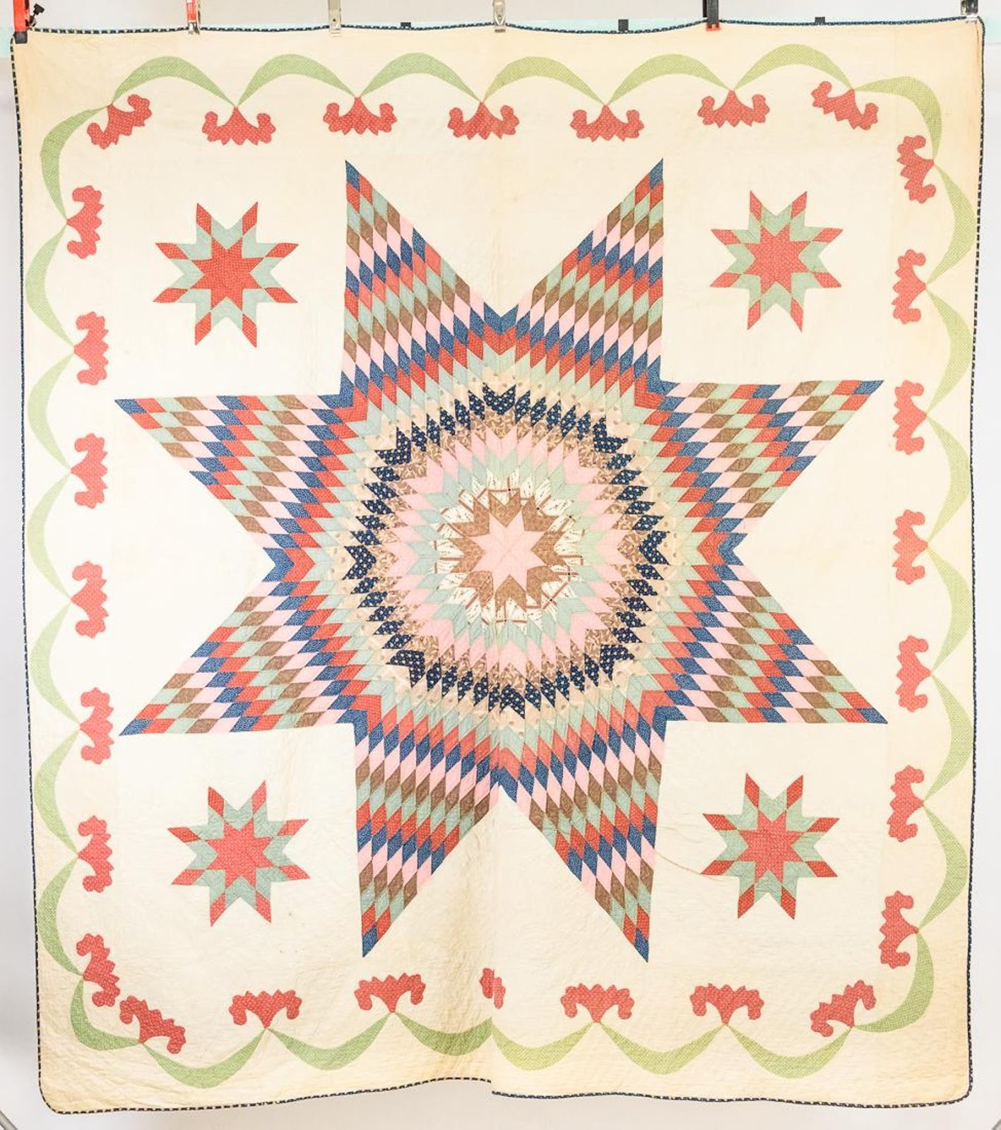 The quilt was later documented in the Indiana Project where it was photographed in light that shows the quilting. The family noted the quilting had been done about 1910 (Did Marie Webster's business have something to do with that?)